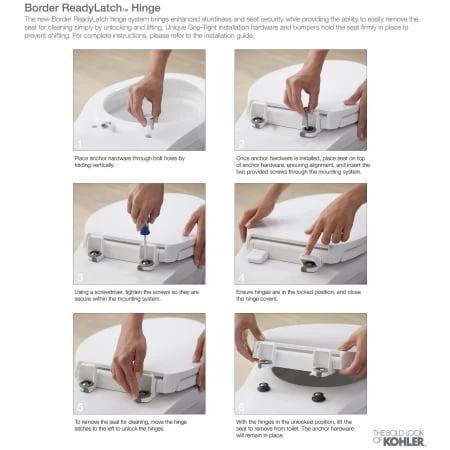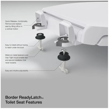 Designed to fit most elongated toilets, the Border antimicrobial toilet seat combines subtle styling with innovative technology. The new ReadyLatch hinge system brings enhanced robustness and seat security while providing the ability to easily remove the seat for cleaning. Unique Grip-Tight installation hardware and bumpers hold the seat firmly in place to prevent shifting, and Quiet-Close prevents the seat from slamming.
