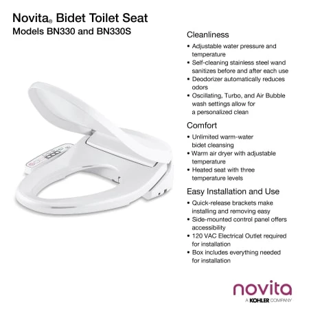 The Novita BN-330S cleansing seat offers a compact, low-profile design that blends in beautifully with your existing toilet. The BN-330S offers advanced features at an excellent value, including warm water on demand, twin nozzles for front and rear cleansing, and fully adjustable water temperature and pressure for your comfort. This easy-to-install cleansing seat is equipped with a quiet-close heated seat and sittable lid